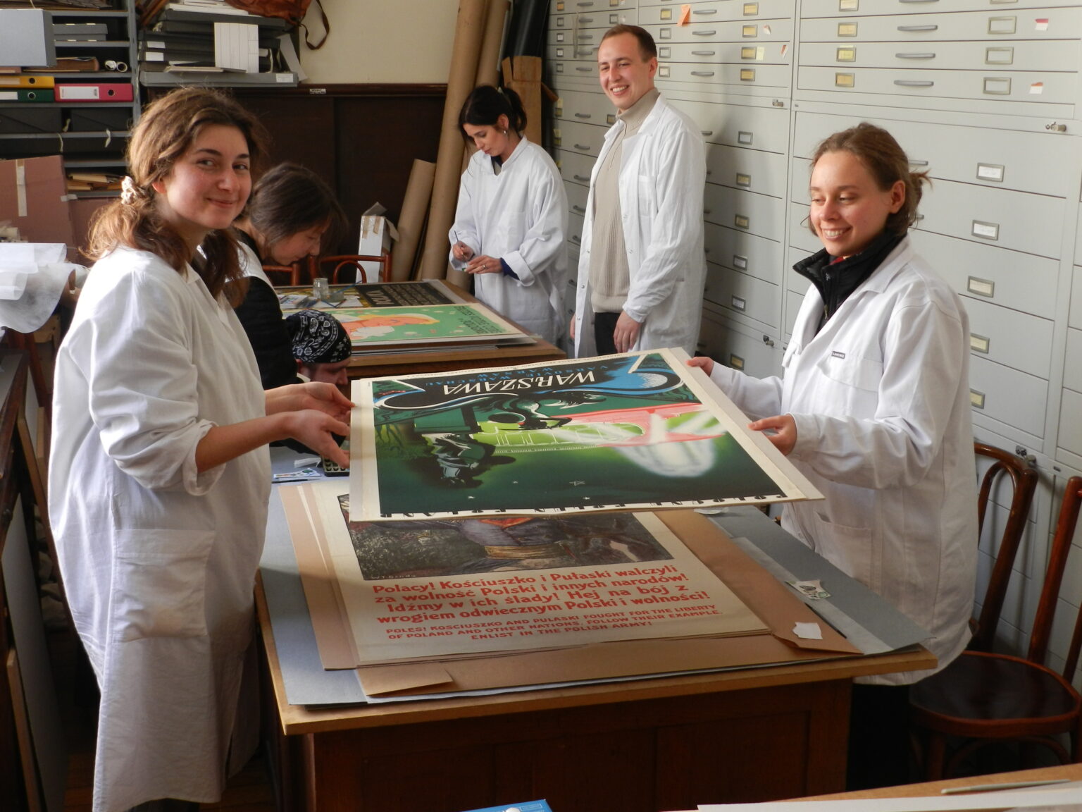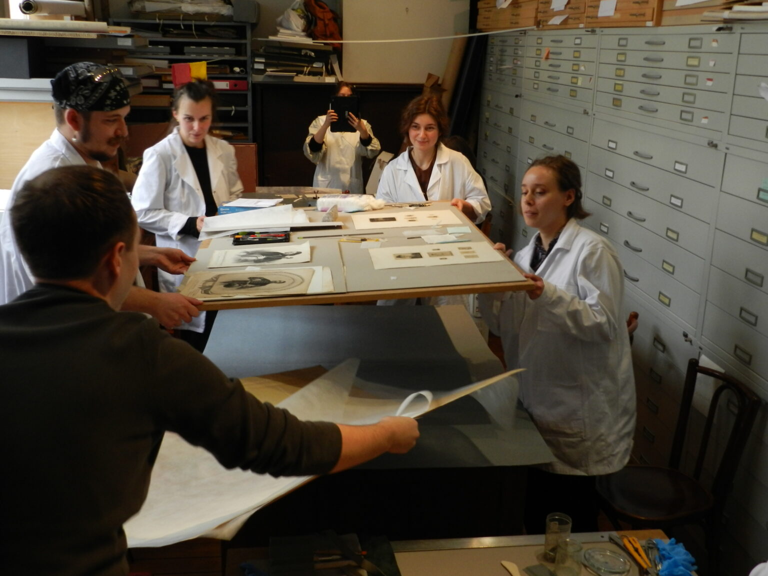 W trakcie pobytu w Bibliotece Polskiej nasi studenci i studentki kontynuowali zaczęte w ubiegłym roku prace przy obiektach rysunkowych z kolekcji Gronkowskiego. Rozpoczęto również działania zabezpieczające i prewencyjne obejmujące zbiór litografii, plakatów z lat 20tych i 30tych XX wieku oraz grafiki z ekspozycji stałej prezentowanej w Salonie Chopina.