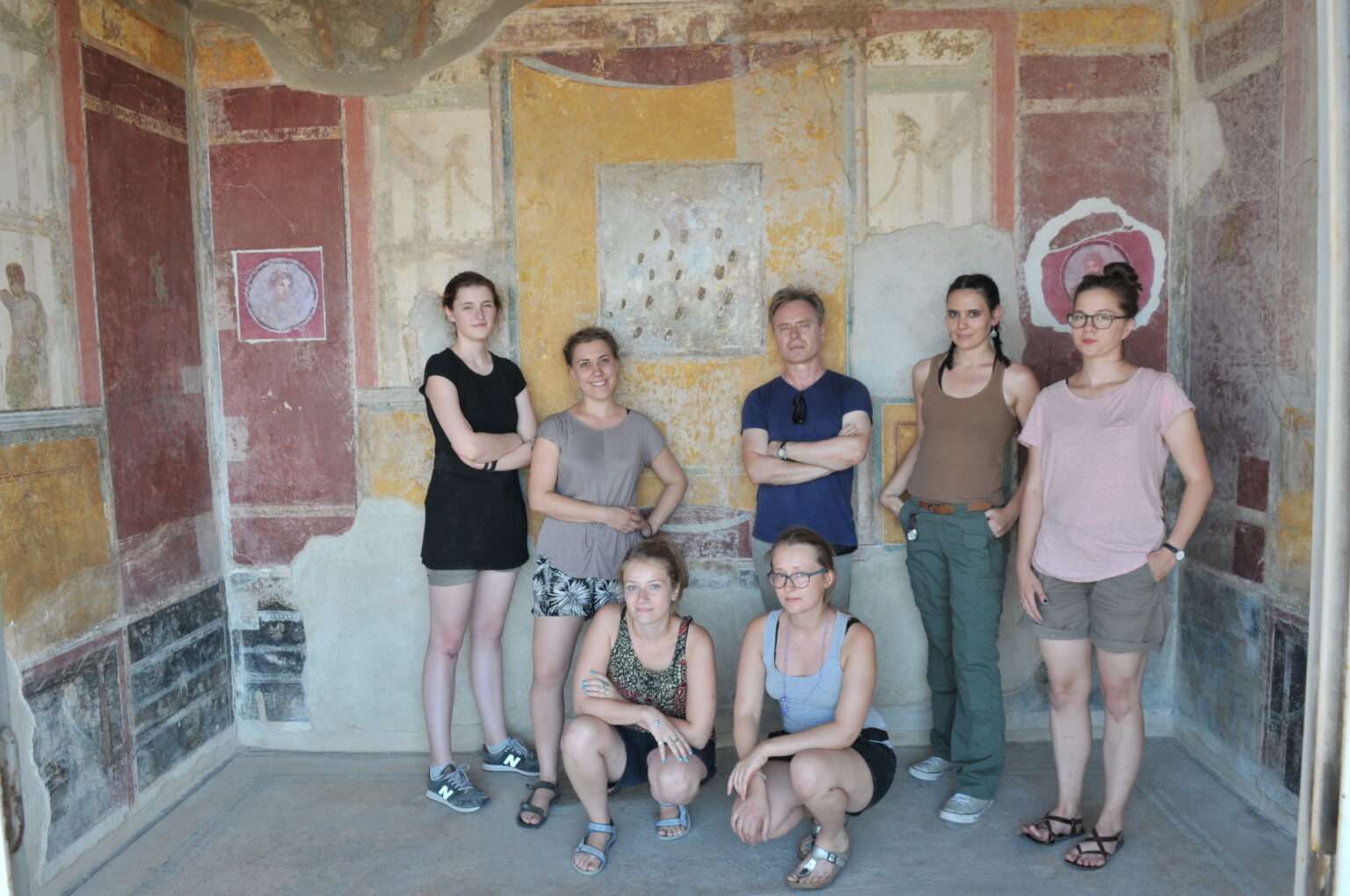 Trwa kolejny sezon prac badawczo konserwatorskich w Stabiae realizowanych przez Wydział Konserwacji i Restauracji Dzieł Sztuki warszawskiej ASP. Podobnie jak Pompeje i Herkulanum, antyczne Stabiae zostało zniszczone przez wybuch Wezuwiusza w 79 r. n.e. W reprezentacyjnej Willi Arianna zachowały się wspaniałe rzymskie dekoracje ścienne. Dotychczas studenci pod kierunkiem pedagogów Wydziału zakończyli konserwacje malowideł w trzech pomieszczeniach dekorowanych w tzw. drugim stylu pompejańskim. W bieżącym roku kontynuowane są prace w pomieszczeniu Ambiente 7 i jednocześnie rozpoczęły się w pobliskim Ambiente 11. Ich ściany zdobią malowidła w tzw. czwartym stylu pompejańskim powstałe w okresie poprzedzającym zniszczenie willi. Na kontrastowo zestawionych czerwonych, żółtych, czarnych i białych tłach przedstawione są elementy architektoniczne z fantazyjnie zestawianymi kolumnami i gzymsami, rozwieszone pomiędzy nimi roślinne girlandy, postacie ludzkie, teatralne maski, martwe natury i pejzaże. Poważnie zniszczone malowidła wymagają pilnej interwencji. Wzmacniane są warstwy tynków oraz złuszczone i ścierające się warstwy malarskie, ich powierzchnia jest oczyszczana z grubych i szkodliwych nawarstwień soli. Każdego dnia kolejne fragmenty bezcennych dekoracji powoli