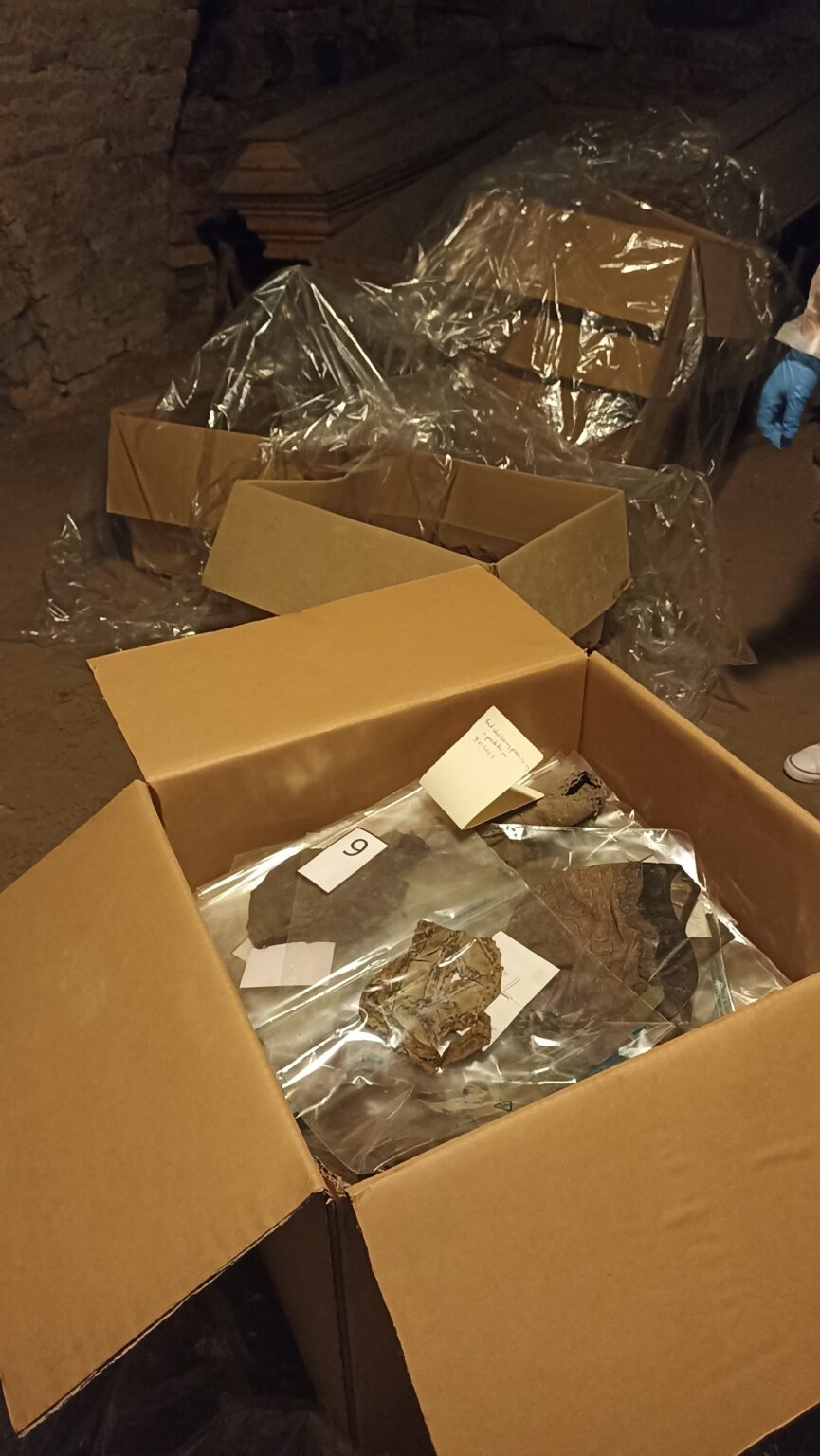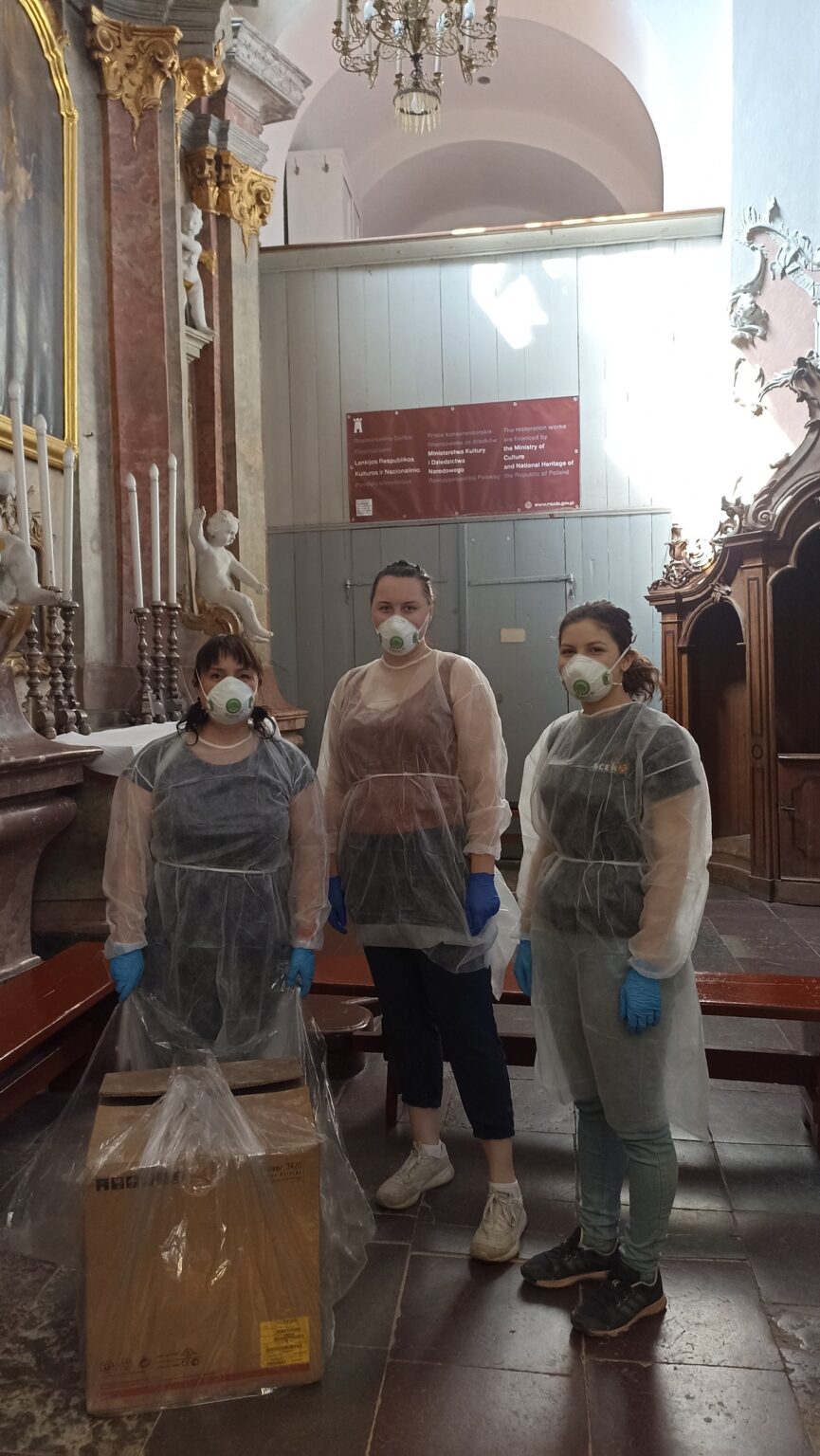 Przez tydzień studentki Konserwacji i Restauracji Tkanin Zabytkowych na Wydział Konserwacji i Restauracji Dzieł Sztuki ASP Warszawa: Małgorzata Bogusz, Justyna Małyszko i Gabriela Paciorkowska, pod kierunkiem dr Moniki Stachurskiej, będą eksplorować zawartość kartonów złożonych w podziemiach kościoła oraz zachowane tam tekstylia.