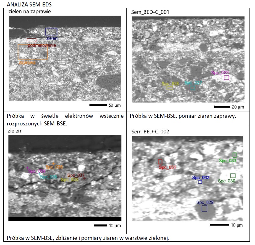 W realizacji zadania badawczego zastosowano nieniszczące metody obrazowania, wykorzystujące promieniowanie ultrafioletowe (ocena fluorescencji powierzchni obrazu wzbudzonej promieniowaniem ultrafioletowym), podczerwone (ocena warstw spodnich przy użyciu reflektografii w podczerwieni), zdjęcia w świetle widzialnym (VIS) oraz mikro- i makrofotografia. Do analiz stratygraficznych, identyfikacji pigmentów i spoiw wykorzystano instrumentalne metody wymagające pobrania niewielkich próbek. Analizy składu pierwiastkowego wykonano przy pomocy skaningowego mikroskopu elektronowego sprzężonego z mikrosondą elektronową EDS (analiza SEM-EDS).
