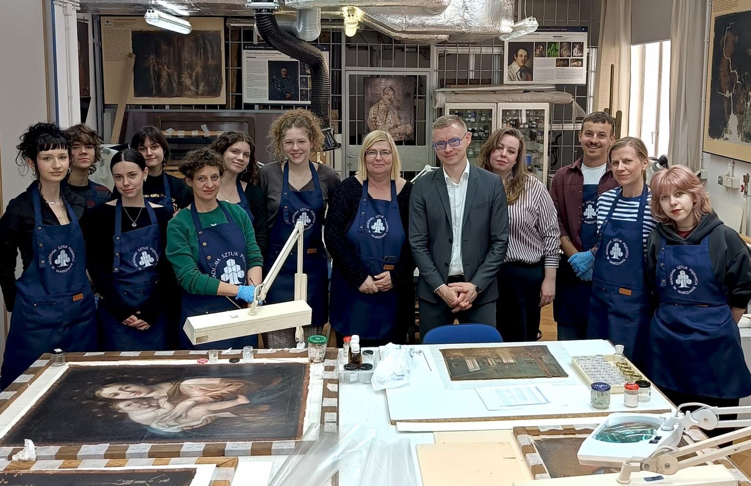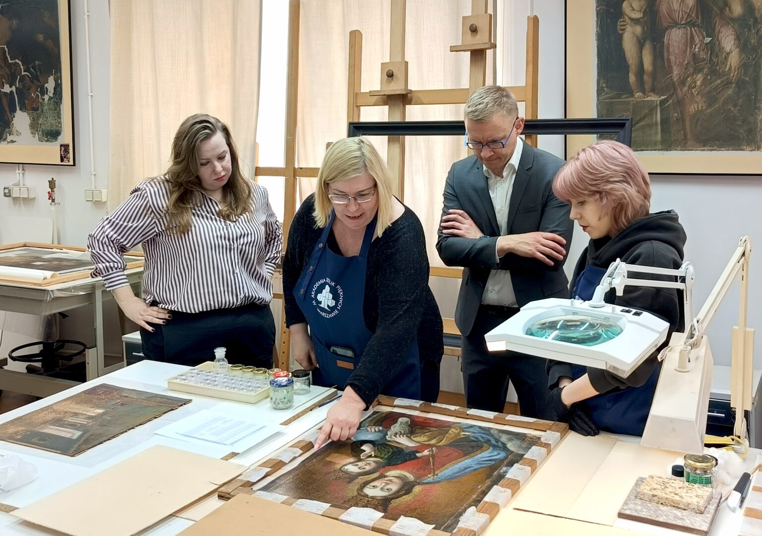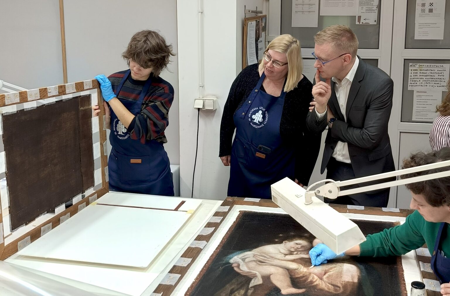 W dniu 27 lutego 2026 r. miała miejsce na Wydziale Konserwacji wizyta Mazowieckiego Wojewódzkiego Konserwatora Zabytków pana Marcina Dawidowicza wraz z panią Pauliną Maniewską z zespołu ds. zabytków ruchomych. Urząd MWKZ ściśle współpracuje z WKiRDS ASP w Warszawie w ramach otwartego w 2022 r. projektu badań i konserwacji obrazów z klasztoru Sióstr Wizytek w Warszawie. W Pracowni Konserwacji i Restauracji Malarstwa na Podłożach Ruchomych studenci pod kierunkiem prof. ASP dr hab. Anny Potockiej, adi. dr Katarzyny Góreckej-Ruszel oraz asyst. Łucji Nowak-Wróblewskiej prowadzą prace konserwatorskie nad nową grupą 12 obrazów pochodzących z klasztoru. Komisja konserwatorska zapoznała się z wynikami i postępem prac, studenci mogli zaprezentować swoje indywidualne projekty, na spotkaniu omówiono także dalsze perspektywy współpracy.