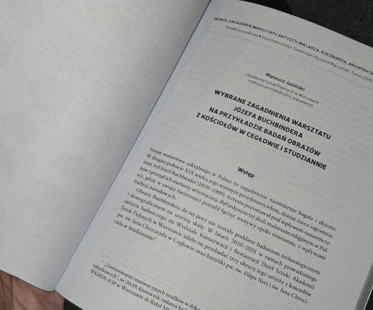 W publikacji znajdziecie artykuł dr Mateusz Jasińskiego „Wybrane zagadnienia warsztatu Józefa Buchbindera na przykładzie badań obrazów z kościołów w Cegłowie i Studziannie ” stanowiący podsumowanie projektu badawczego „Badania technologiczne obrazów Józefa Buchbindera (1839-1909)” realizowanego w ramach badań statutowych „Zastosowanie innowacyjnych środków w dokumentacji, badaniach i konserwacji obiektów zabytkowych”, nr. 20/19, kierownik dr Rafał Nijak